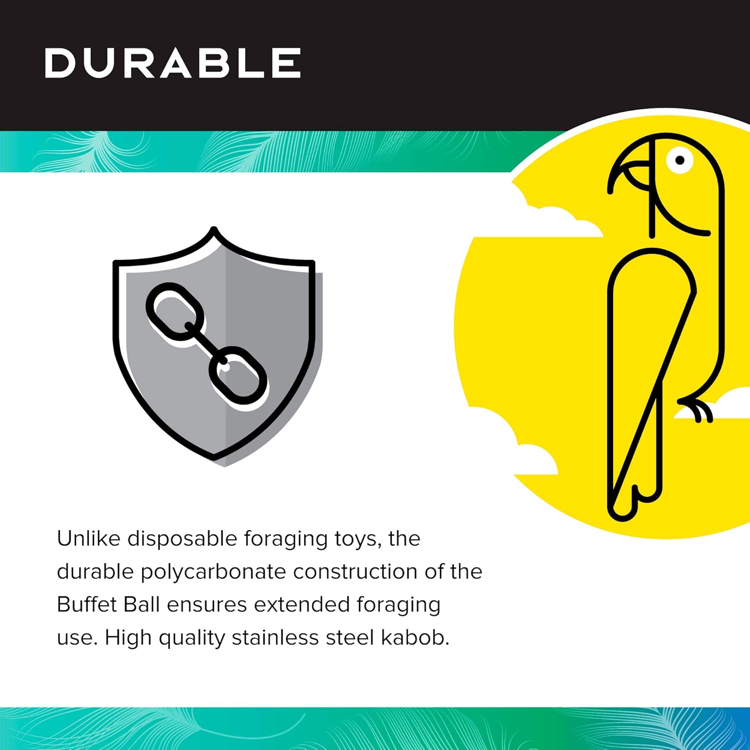 - DURABLE: Unlike disposable foraging bird toys, the durable polycarbonate construction of the Buffet Ball ensures extended foraging use; High quality stainless steel attachment is easy to install