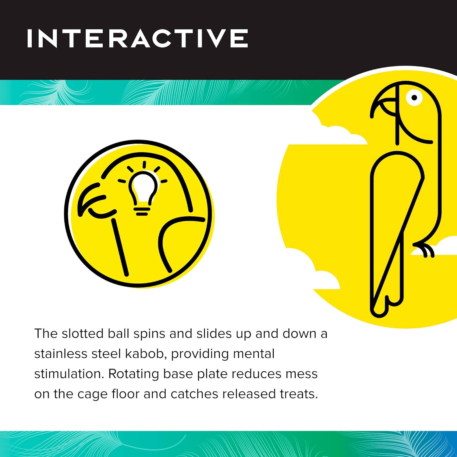 - FUNCTION: The slotted ball spins and slides up and down a stainless steel kabob, providing mental stimulation; Rotating base plate reduces mess on the cage floor and catches released bird treats