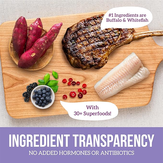 - Protein Sources for Vitality: Buffalo and whitefish deliver essential proteins and Omega-3s to support your dog’s overall health.