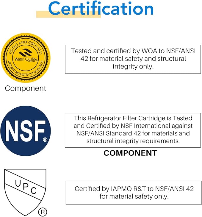 - Authoritative Certifications - Tested and certified against NSF/ANSI 42 to reduce 99.06% Chlorine. Reduce sand, sediments, particles, rust, color. Significantly improve the drinking water taste. The filter also meets European EC1935-2004 Regulations, and the Australian Water Mark, and has the certificatons of TUV, ROHS, REACH, and BPA FREE.