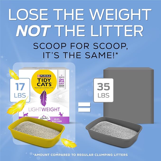 - LIGHTER CAT LITTER: Tidy Cats cat litter lightweight formula is 50 percent lighter than the leading clumping litter--less weight, not less litter