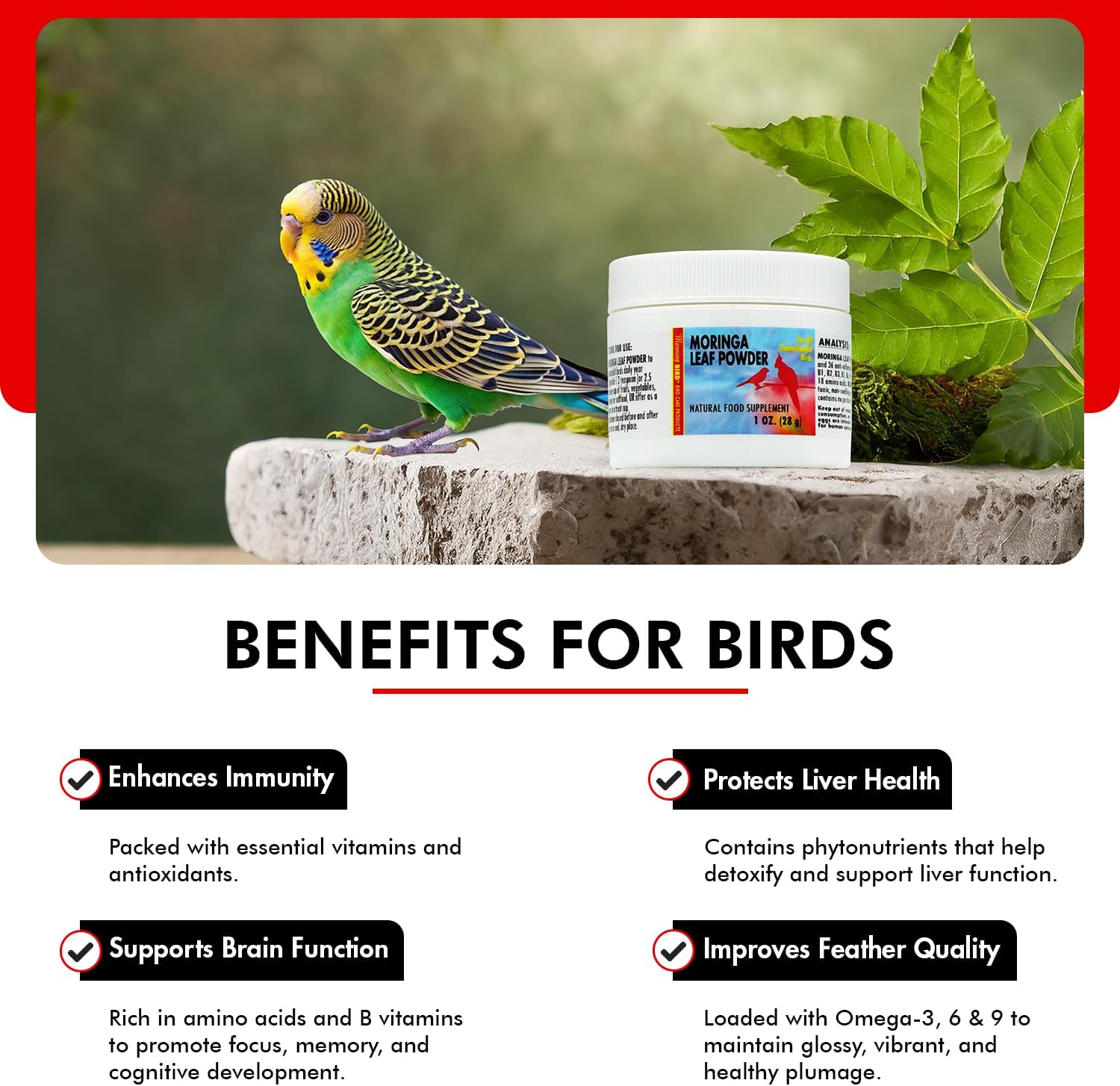 Morning Bird Moringa Leaf Powder 1 oz – Natural Food Supplement for Birds, Rich in Vitamins & Minerals, Boosts Immune System & Energy, Supports Healthy Feathers, Digestion, and Overall Avian Wellness