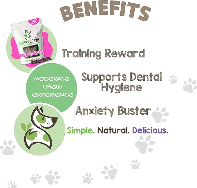- RAWHIDE-FREE CHEWS - Nature Gnaws Beef Gullet Chews are low-odor, grain-free and gluten-free, making them the perfect alternative to rawhide chews and manufactured dog bones. NATURAL DENTAL CHEWS - Durable and long lasting, the natural act of chewing helps reduce plaque and tartar for cleaner teeth and fresher breath. Promoting overall good dental hygiene, these natural chews for dogs will keep your pet busy and satisfied.