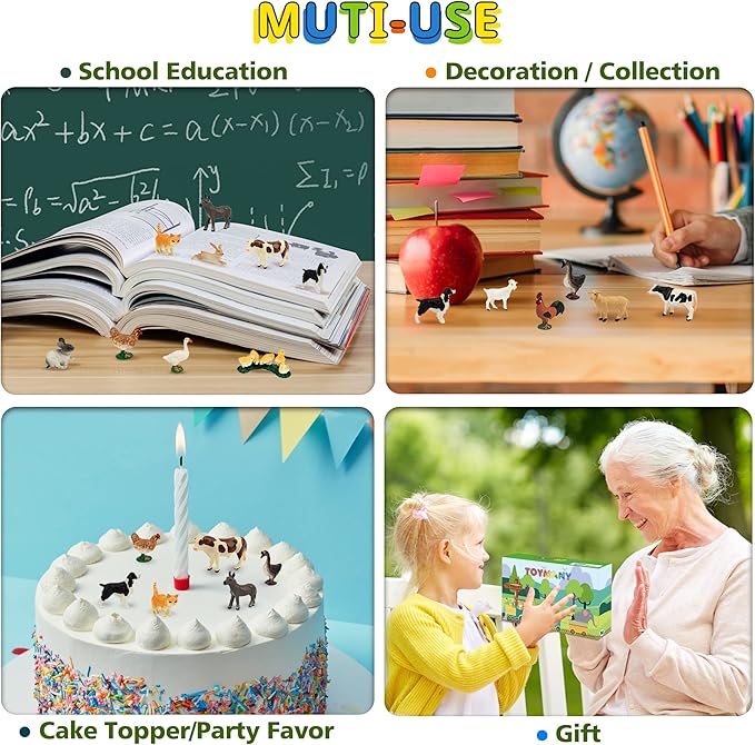 - [Decorative Cake Toppers] There are various little farm animals that come in this set. They can be used as cake toppers and build a farm animals themed cake for your children. Such adorable and diverse animal sculptures are worth collecting and displaying on children's bookcases, desks and rooms. It would make an excellent birthday present for children.