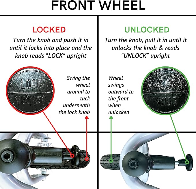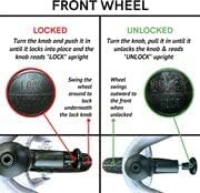 - Can be used as a push stroller or a bike trailer. To lock/unlock the front wheel the pin pulls out and twists.