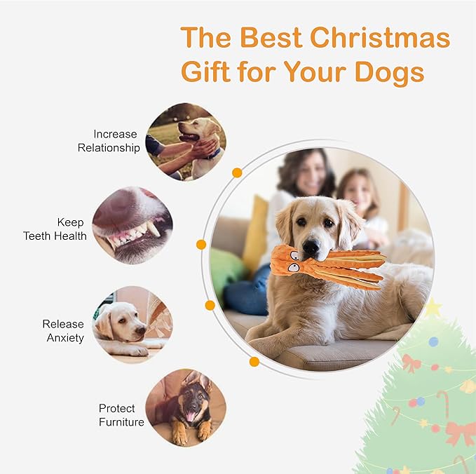 Octopus Squeaky Plush Dog Toys - No Stuffing, Crinkle, Durable for Puppy Teething, Small to Large Dogs, 2 Pack