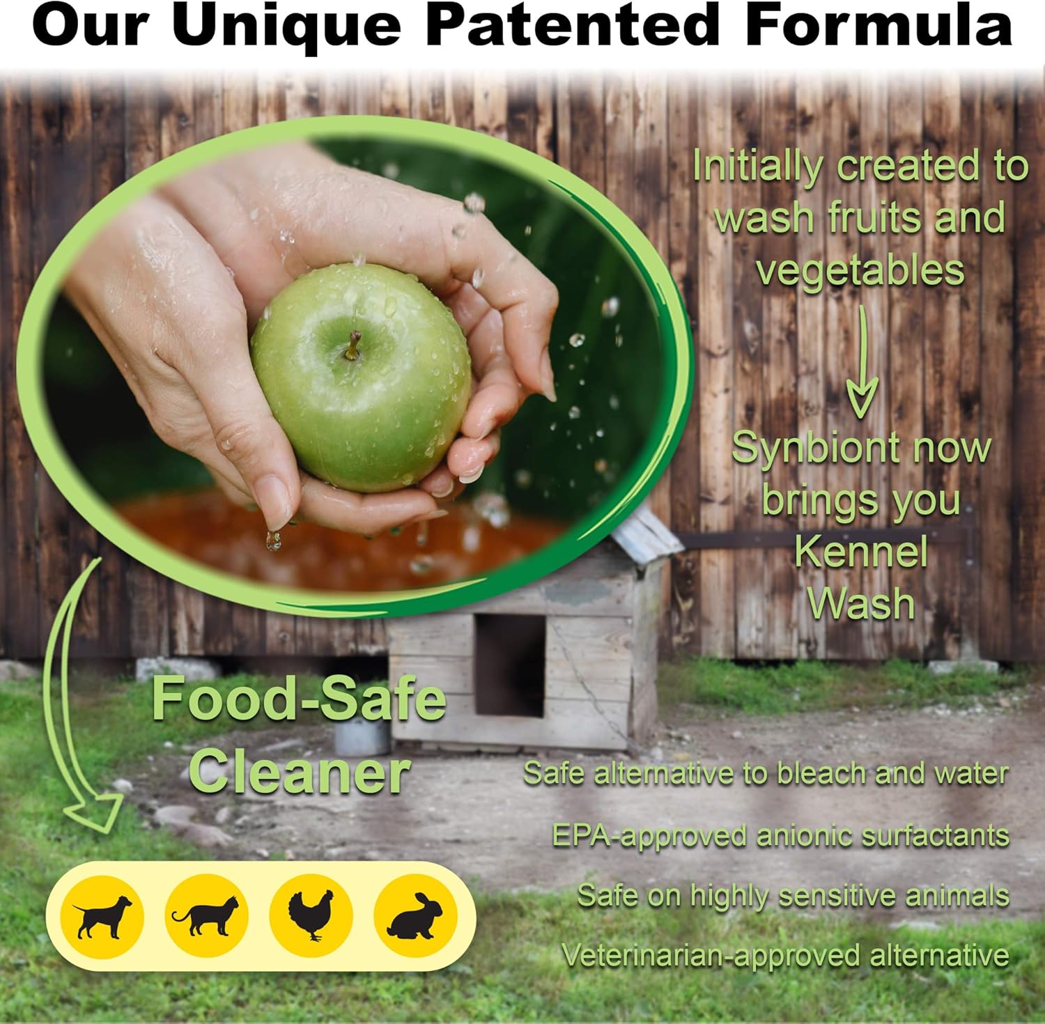 - BLEACH ALTERNATIVE - Unlike traditional toxic sanitizing steps such as bleach or chlorine, Synbiont Kennel Wash allows for an environmentally friendly alternative to cleaning that doesn't require re-entry restrictions, is non-corrosive and can be used freely around your pets.