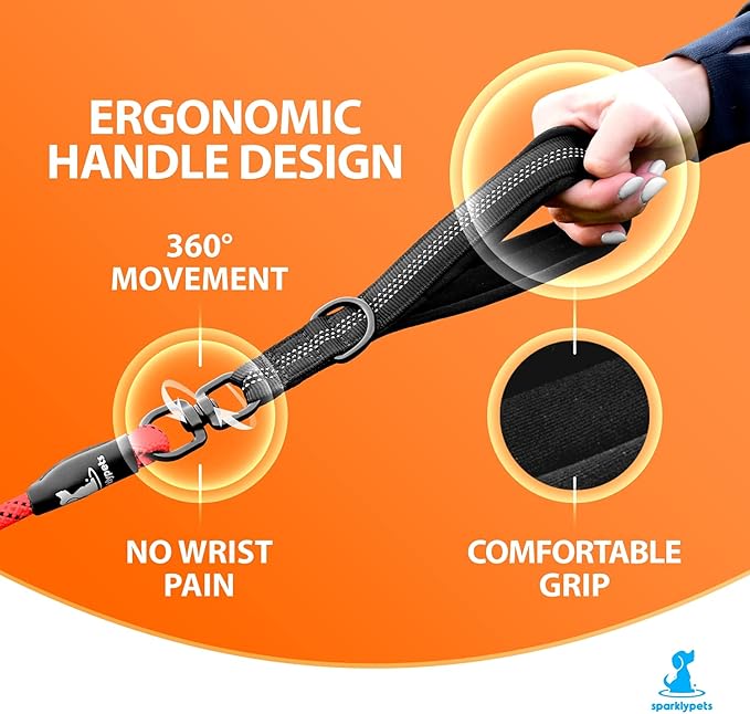 - Bungee dog leash for large dogs with ergonomic handle design - this unique handle doesn’t just look great. It brings a lot of functionality, from the padded handle that offers a comfortable handgrip to the extra 360° coupler that eliminates the risk of wrist sprain.