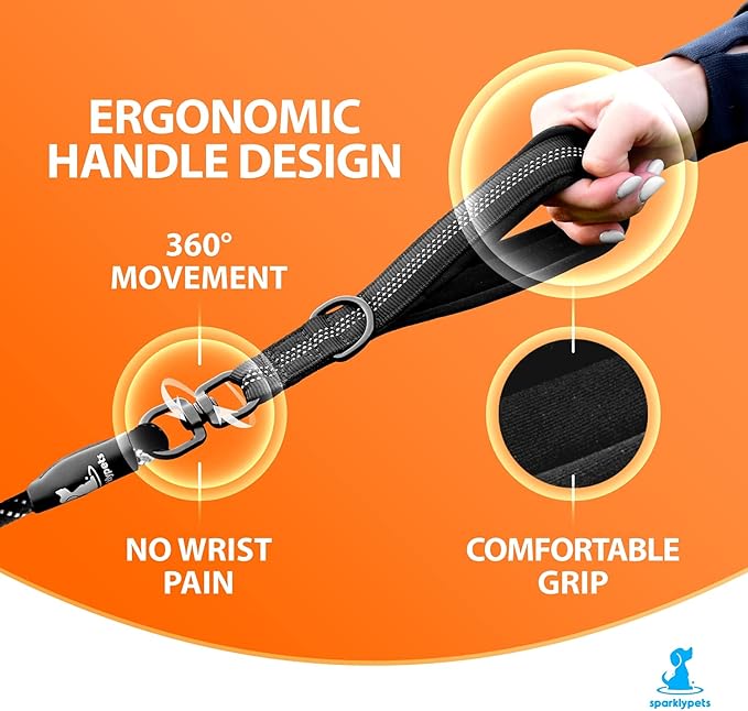 - Bungee dog leash for large dogs with ergonomic handle design - this unique handle doesn’t just look great. It brings a lot of functionality, from the padded handle that offers a comfortable handgrip to the extra 360° coupler that eliminates the risk of wrist sprain.