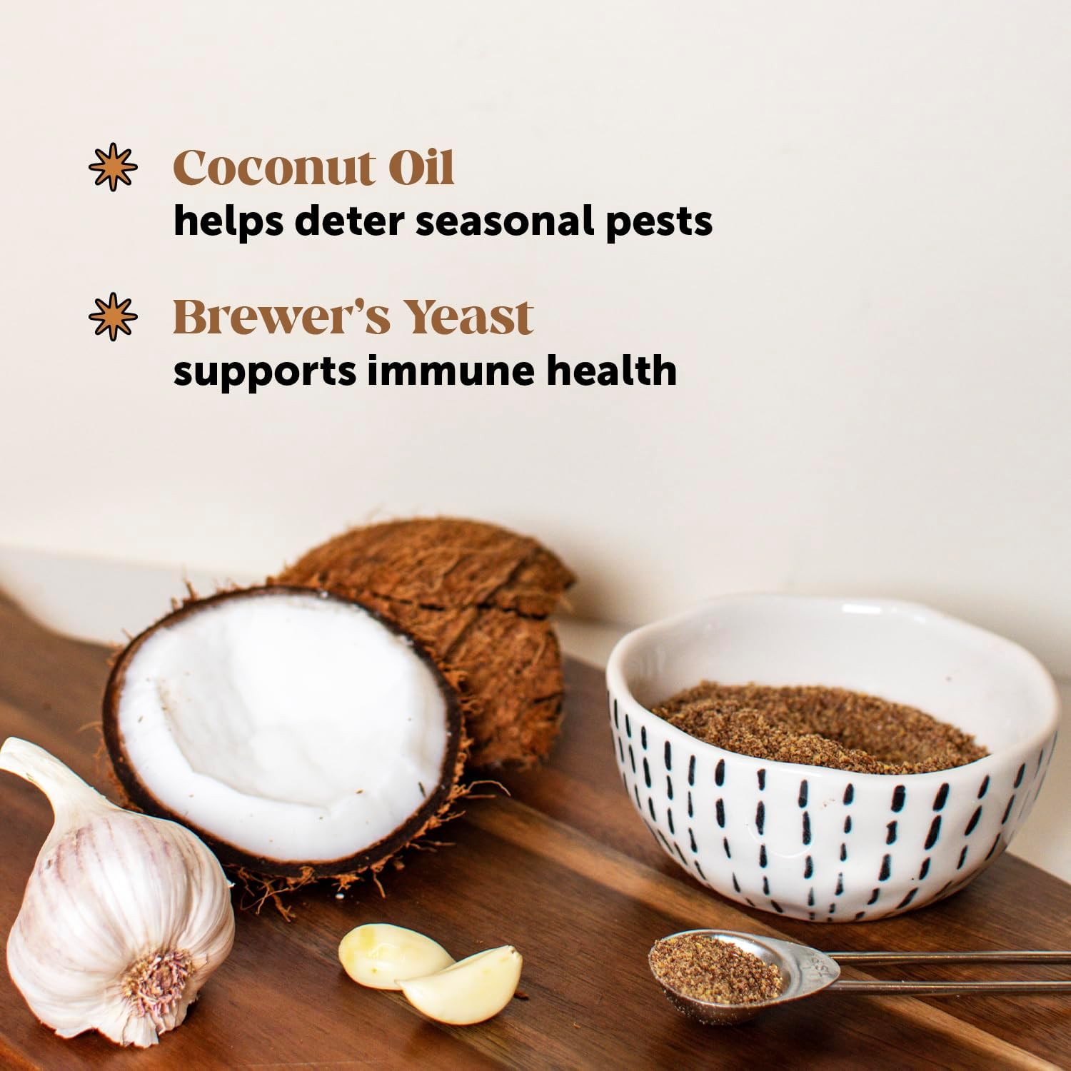- Active Ingredients : Brewer's Yest, Coconut Oil, Garlic Powder, Flaxseed, Hemp Seed Powder, Apple Cider Vinegar, Vitamin B12, Vitmin B1, Vitamin B6 Brewer's Yest, Coconut Oil, Garlic Powder, Flaxseed, Hemp Seed Powder, Apple Cider Vinegar, Vitamin B12, Vitmin B1, Vitami… See more