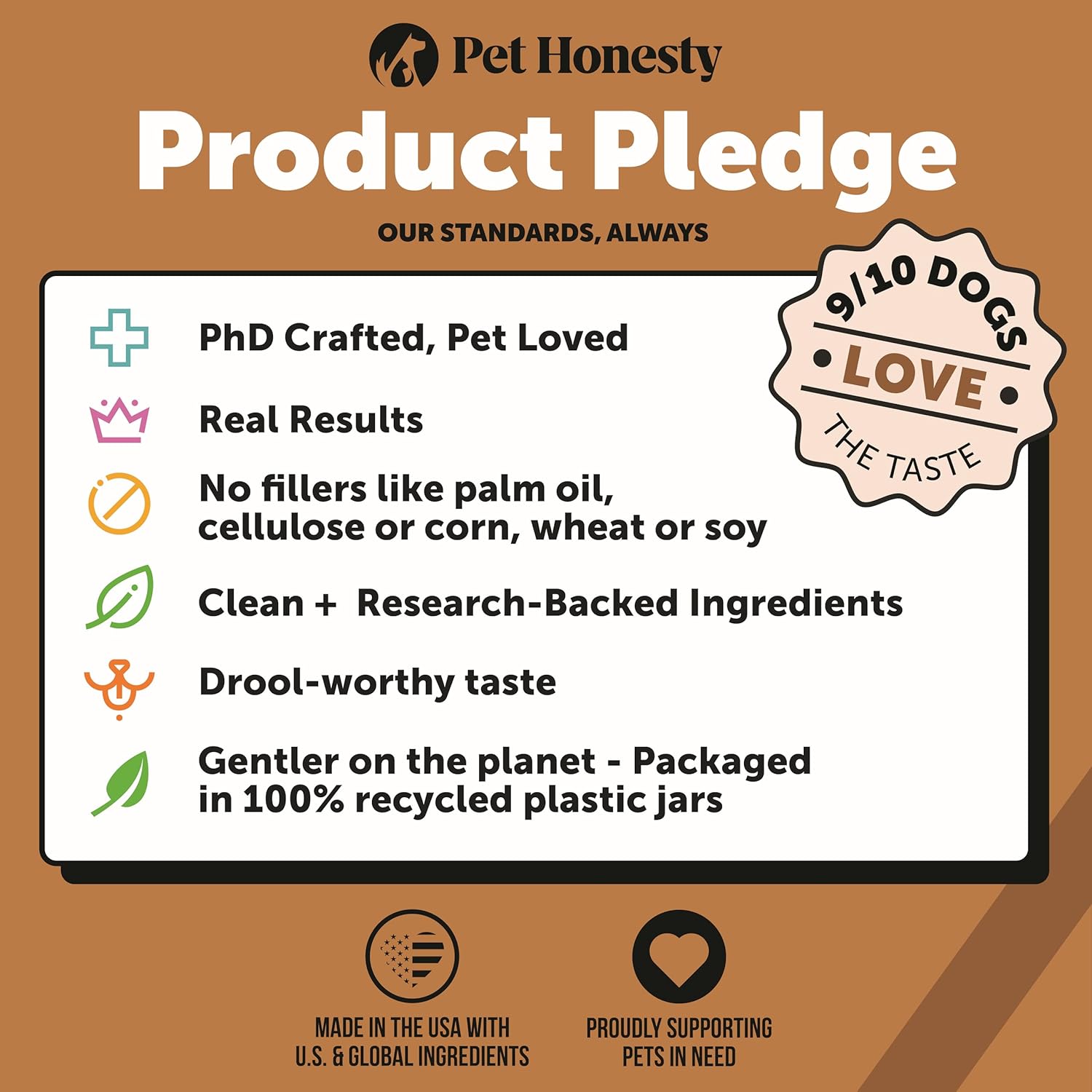 - THE HONEST DIFFERENCE: Our products are made with clean, science-backed ingredients for results you can trust, & with no fillers, artificial preservatives, colors, or flavors, you'll have no doubt your dog is getting the best. Proudly supporting pets in need nationwide & using recycled plastic in our packaging, there's also no doubt that we're committed to doing our best. -- All products are made in the US.