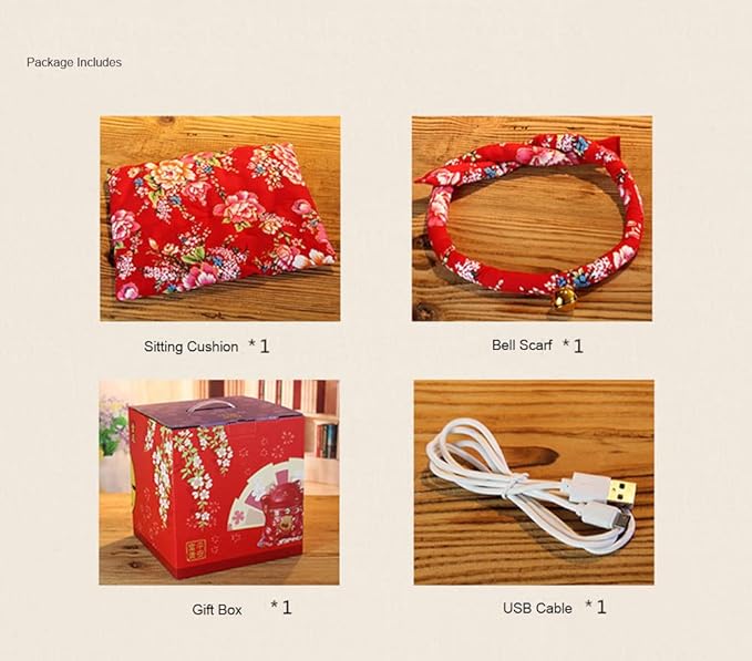 - Package include: Large maneki-neko,USB power cable, one sitting cushion, bell scarf, Gift Box