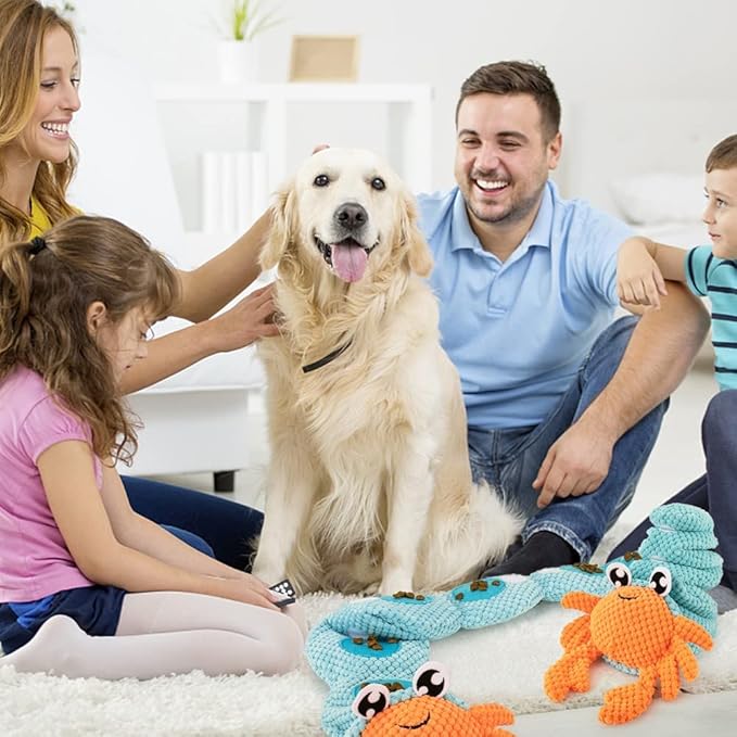 - [GRAB YOUR DOG'S ATTENTION]: To grab the dog's attention, we put a BB sounder on the orange part of the hermit crab and the part of the shell that makes the sound. And fill the mud crab shell with crepe paper, let the cute hermit crab make various sounds to attract the dog to play. Your puppy will love this squeaky toy. This adorable plush dog toy is the ideal gift for your furry friend.