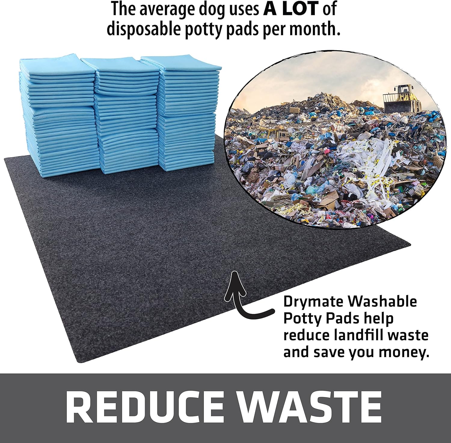 - HELP REDUCE LANDFILL WASTE & SAVE MONEY: Drymate Washable & Reusable Potty Pads provide an environmentally-friendly solution for dog potty training by eliminating the need for disposable pads, helping to reduce landfill waste and save you $$$. CONTAINS ACCIDENTS & PROTECTS SURFACES: Our potty pads quickly absorb urine and protect floors from potty training accidents in and around the home.