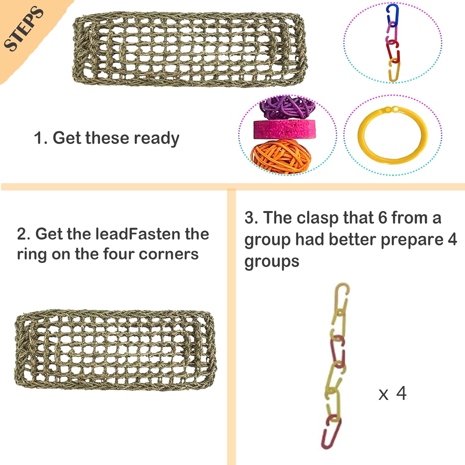 - 【PRODUCT FEATURES】Birds can not only rest on the seagrass mat for birds, but also swing on bird hammock for conures.There are little bells on the chains, and When the parrot pecked the bird seagrass swing, they make a pleasant sound.While avoiding their boredom, Bird seagrass mat also provides a comfortable and safe place.