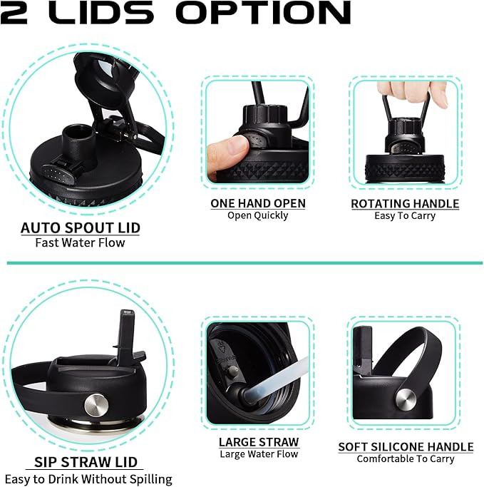 - 2 LID OPTIONS (Auto-spout & Straw): two different lids are complete LEAK PROOF & design for easy drink. The pops-up lid for easy drinking and seals shut for no leaks when you're on the go. The straw lid makes it easy to enjoy spill-proof sips, and package come with a alternative straw & a straw brush for easy cleaning