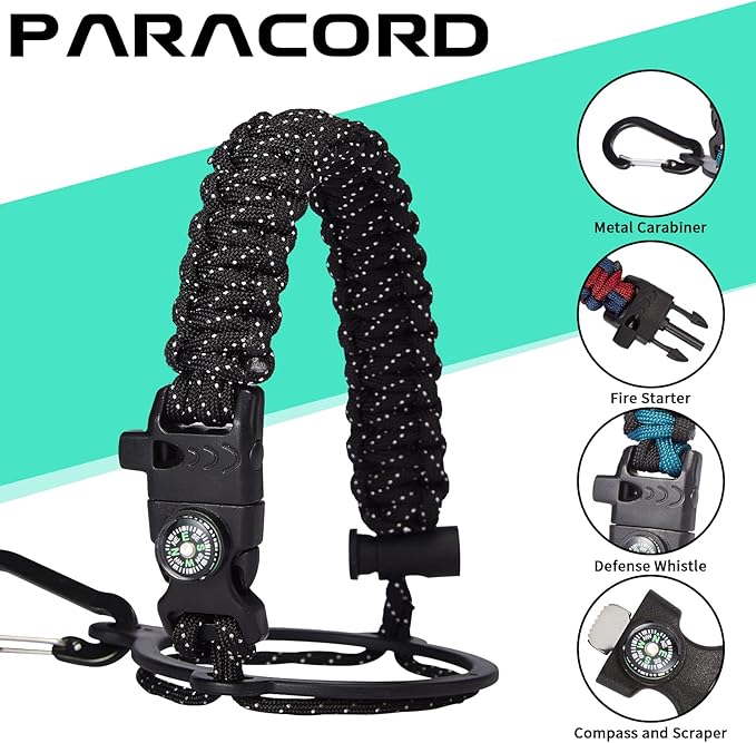 - UNIQUE DESIGNS PARACORD HANDLE: Full-function paracord handle made in individual styles to match the color of the flask water bottles. With compass, safety ring, carabiner, flint fire starter & whistle. It unravels into a sturdy and taut rope in an emergency, making the large water jug an ideal survival kit for expeditions in the wild