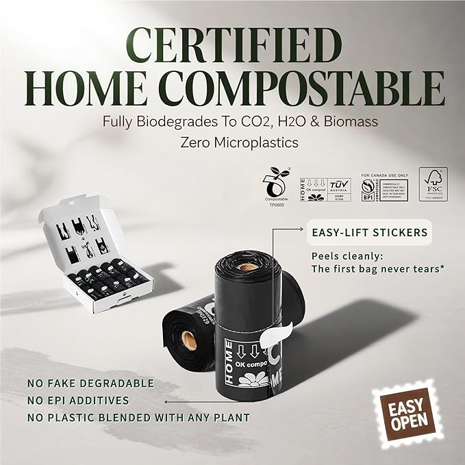 - [🌱Certified Compostable in 90-180 Days] Cleans up while purifying the enviroment! Our thick dog poop bags are plastic-free and free of heavy metals. They decompose naturally into water, CO₂ & biomass. Certified to TÜV OK home compostable, ASTM D6400 and EN13432 standards!