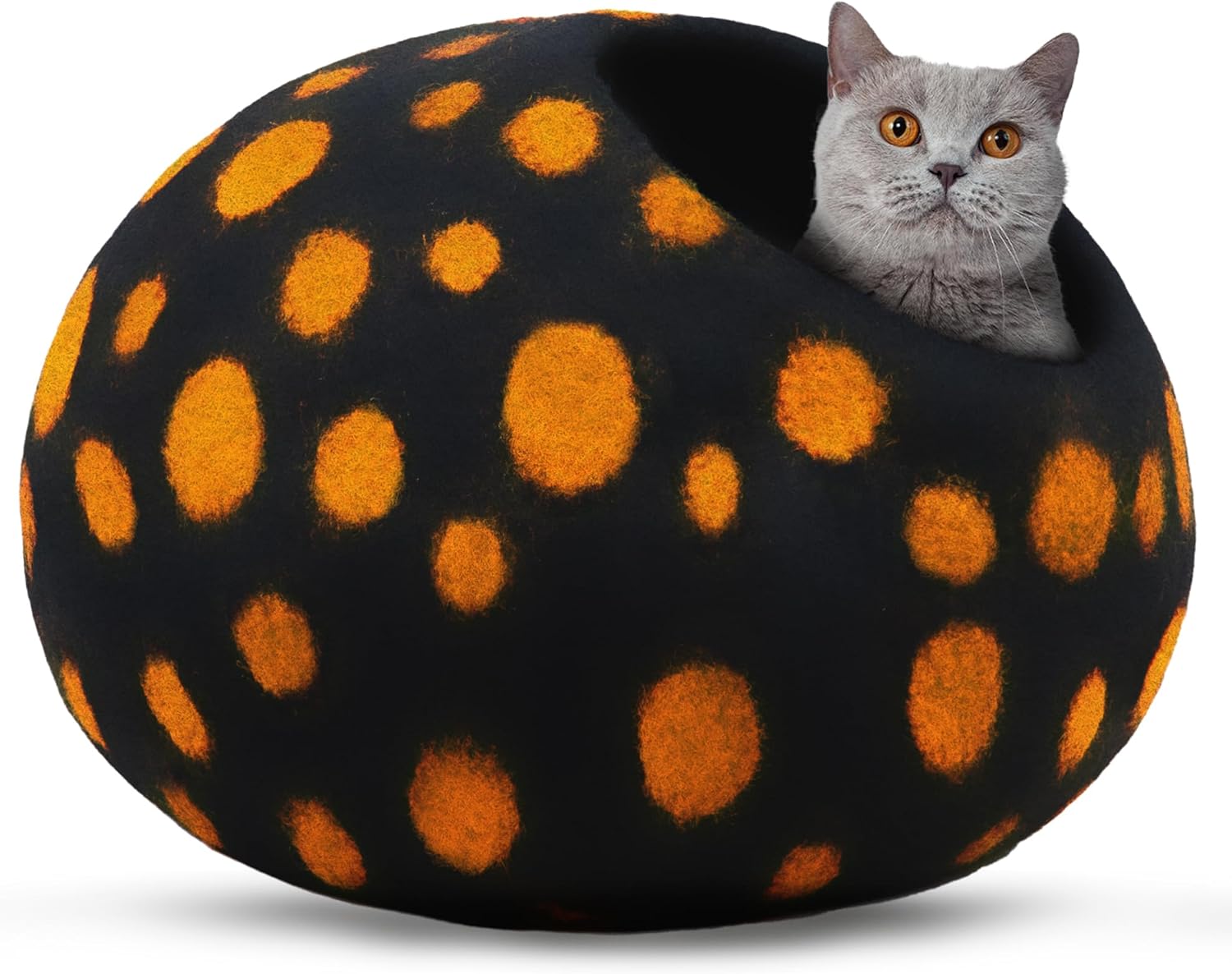 Woolygon Premium Felt Cat Cave Bed - Polka Dot Series - Wool Kitty Beds Handcrafted Kitten Caves Bed for Indoor Cats - Eco-Friendly Merino Wool, Foldable Cat Hideaway Cat Houses (Yellow/Black Dots)