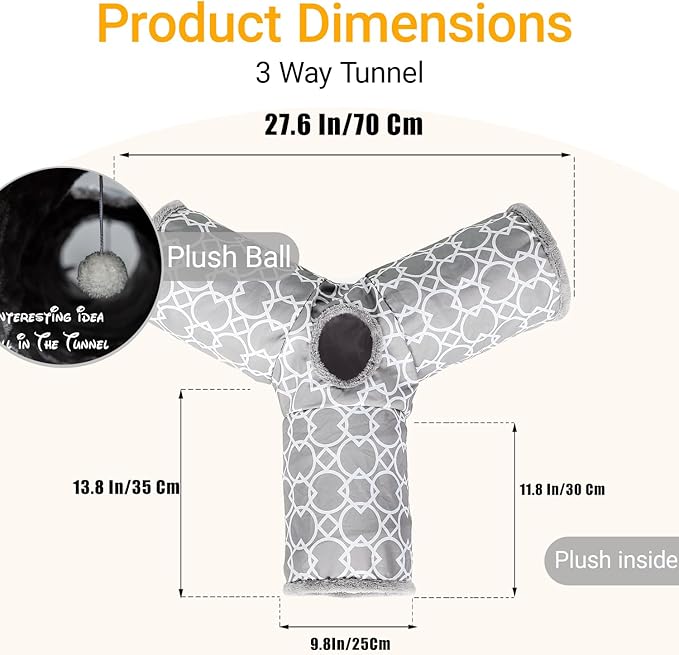 LUCKITTY Geometric 3 Way Cat Tunnel with Plush Inside,Cats Toys Collapsible Tunnel Tube with Balls, for Rabbits, Kittens, Ferrets,Puppy and Dogs