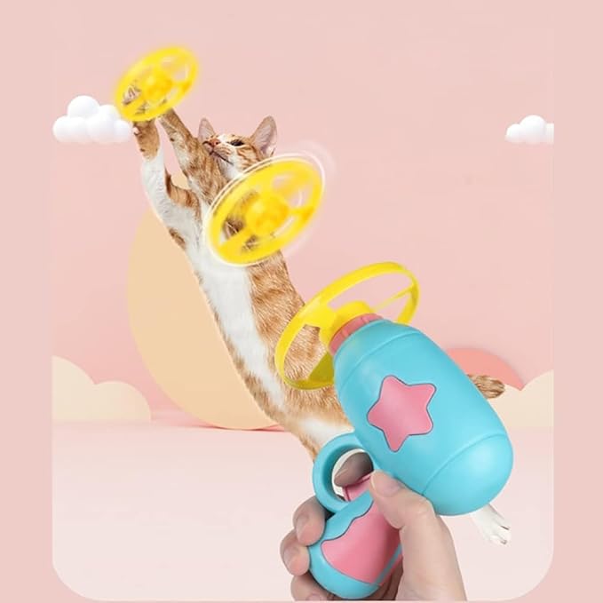 - 【Easy to Play with Cats】First step, please install the propeller at the yellow head of the toy. Second step, wind up the toy by turning the propeller in a clockwise for two or three times. Finally, you can press the yellow trigger forward the direction you wanted and the propeller will fly out. Certainly it's novel and highly efficient to play with your pet cat!