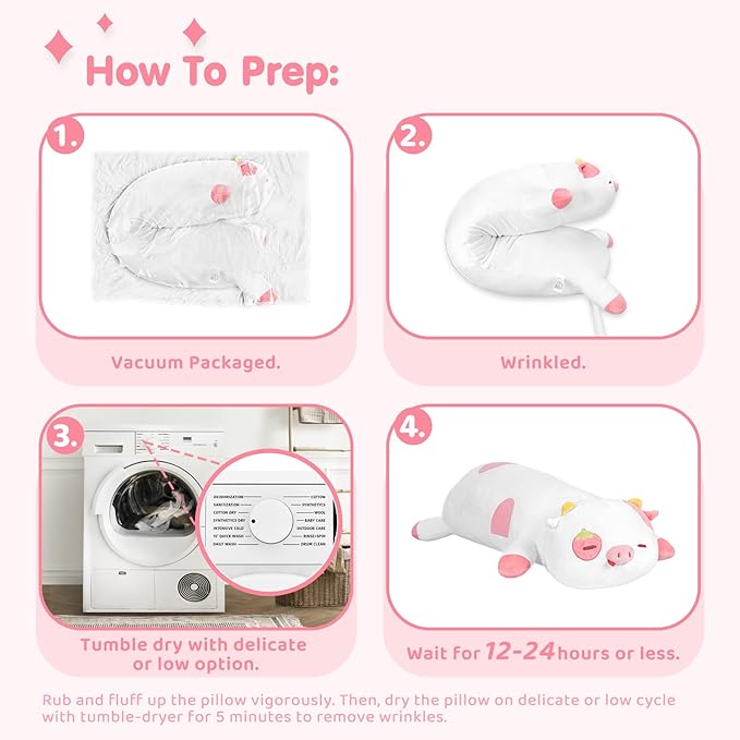 - Easy Washing - Machine washed on the delicate cycle mode or hand washing are all optional. Dry them in a well-ventilated area or tumble-drying with the machine. Remember to fluff up the long plush fully to enjoy the cow body pillow well.