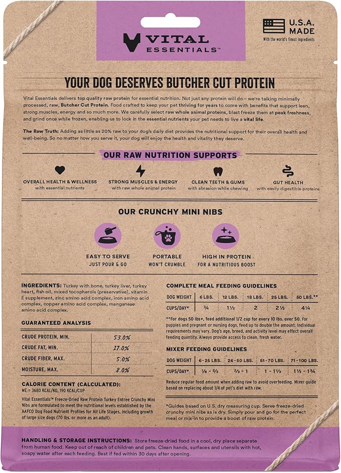 - CRUNCHY FREEZE-DRIED RAW TURKEY DOG FOOD: Vital Essentials Crunchy Freeze Dried Dog Food packs more protein than industry standard into every bite to deliver the peak vitality your dog deserves, especially when compared to dehydrated dog food. This complete and balanced freeze-dried raw dog food is made with premium butcher cut turkey, responsibly sourced in the USA.