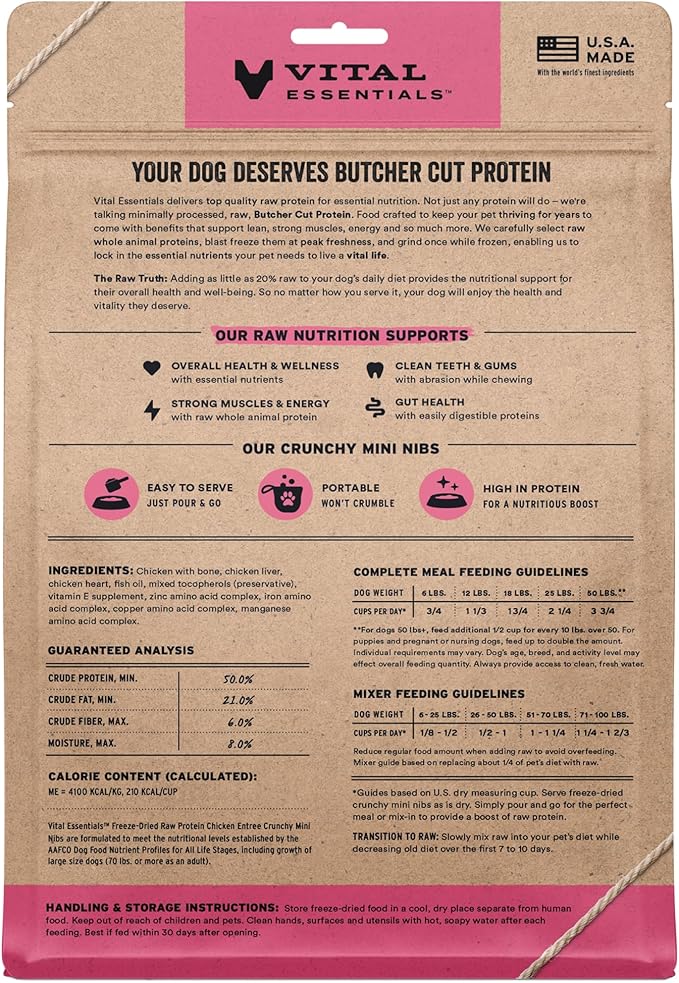 - CRUNCHY FREEZE-DRIED RAW CHICKEN DOG FOOD: Vital Essentials Crunchy Freeze Dried Dog Food packs more protein than industry standard into every bite to deliver the peak vitality your dog deserves, especially when compared to dehydrated dog food. This complete and balanced freeze-dried raw dog food is made with premium butcher cut chicken, responsibly sourced in the USA.