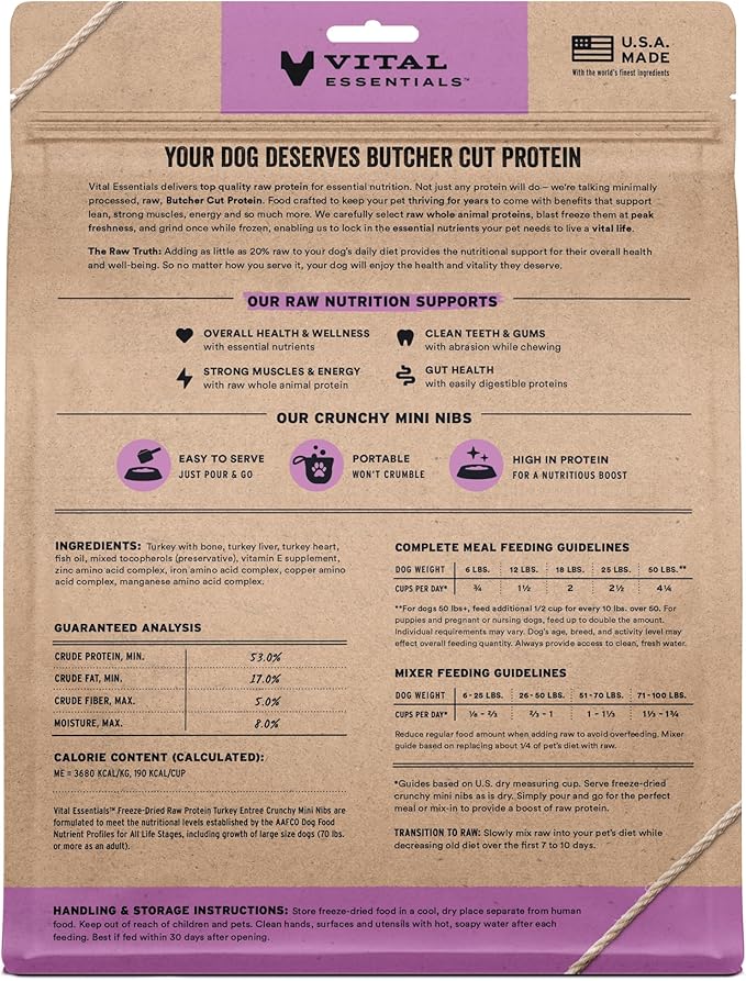 - CRUNCHY FREEZE-DRIED RAW TURKEY DOG FOOD: Vital Essentials Crunchy Freeze Dried Dog Food packs more protein than industry standard into every bite to deliver the peak vitality your dog deserves, especially when compared to dehydrated dog food. This complete and balanced freeze-dried raw dog food is made with premium butcher cut turkey, responsibly sourced in the USA.