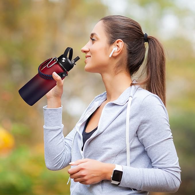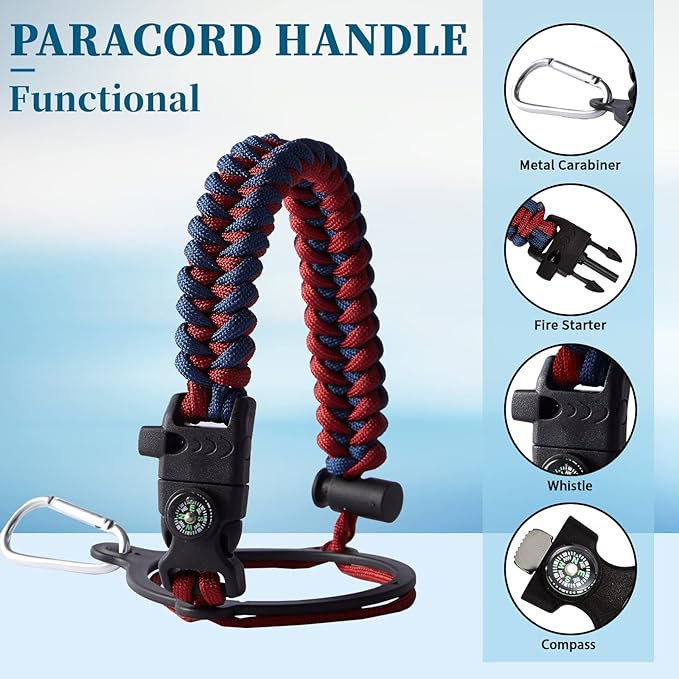 - PERSONALIZATION BOTTLE PARACORD HANDLE - Quarter gallon water bottle with a pretty cool functional paracord handle which does more than meets the eye.?The survival strap cord is made of military-grade nylon and comes with a compass, safety loop, metal carabiner, flint, igniter, and whistle, making it a functional and stylish addition to your thermo water flask, is perfect for outdoor camping, hiking, fitness enthusiasts