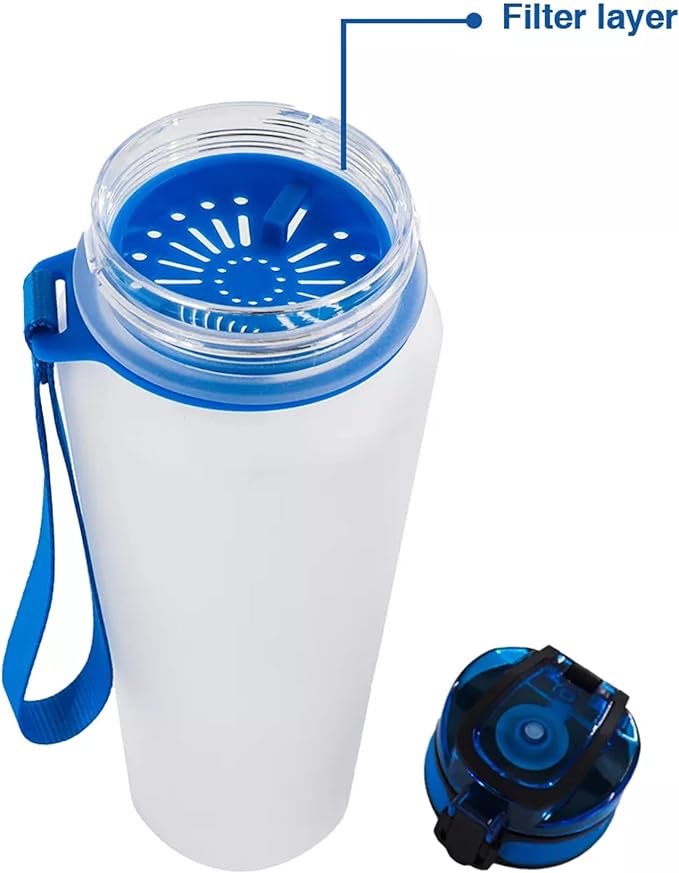 - EASY TO CARRY: Our water bottle is made of frosted material which is pleasant to the touch. Comfortable carry strap enables you to carry your bottle easily when you go out. In addition, the wide mouth with a filter allows you to add enough ice cubes and fruits as well, keeping you hydrated throughout the day.