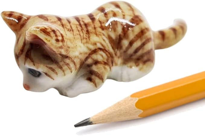 WitnyStore Tiny 1⅝" Long Brown White Tabby Shorthair Cat Crouching Figurine - Miniature Hand Made Painted Ceramic Cats Kitten Feline Animal Cute Porcelain Decorative Collectible Figures Décor Gifts