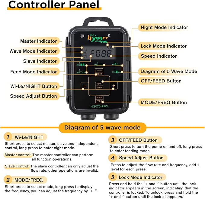 - š INTELLIGENT LED CONTROLLER - With LED display controller, you can set it to different modes to simulate natural living environment 1) 5 wave modes available - pulse wave, sine wave, constant wave, random wave, cross flow wave; 2) 30-100 flow rate levels options; 3) 30-100 frequency levels options; 4) feeding mode; 5) night mode; 6) linkage mode
