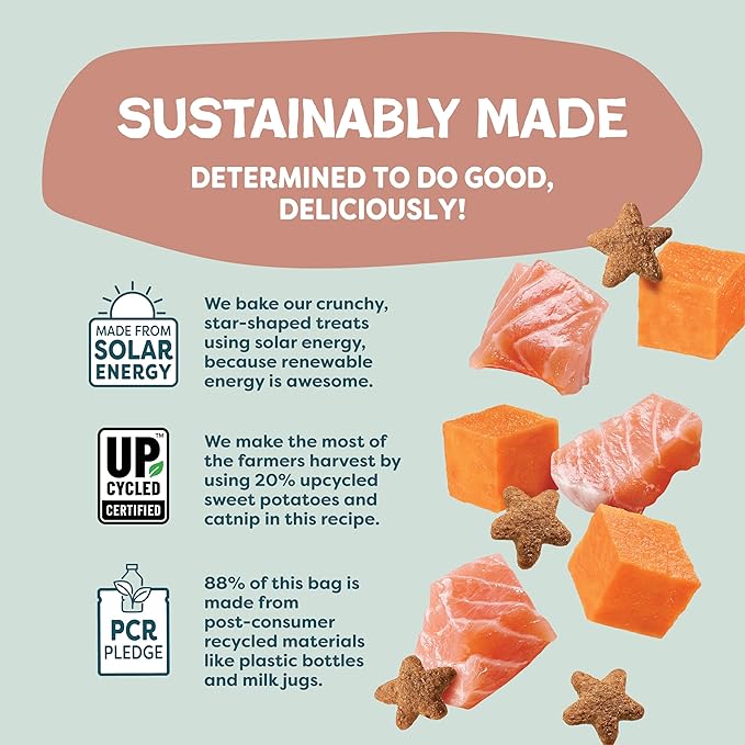 - Cat Treats for Skin & Coat Support: Your cat's skin & coat routine just upped its game. With a few of these delicious crunchy, star-shaped bites, they'll be doing the cat walk with perfection, from head to toe. Made with upcycled sweet potatoes, with added fish oils for that extra skin & coat support, your cat will be lookin' good and feelin' good. Includes one 2.5 oz bag.