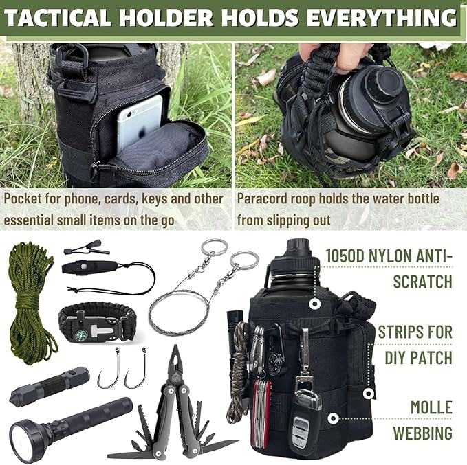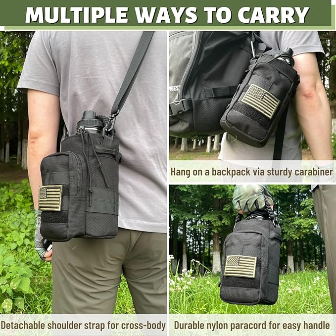 - Tactical Sports Bottle with Holder ◊ The lid with handle, the paracord handle on the water bottle sleeve, and the detachable shoulder strap provide you with a variety of carrying options and travel convenience. The front pocket can hold your cell phone, keys, and other essentials. The Mollo system offers more possibilities to carry more things with you.