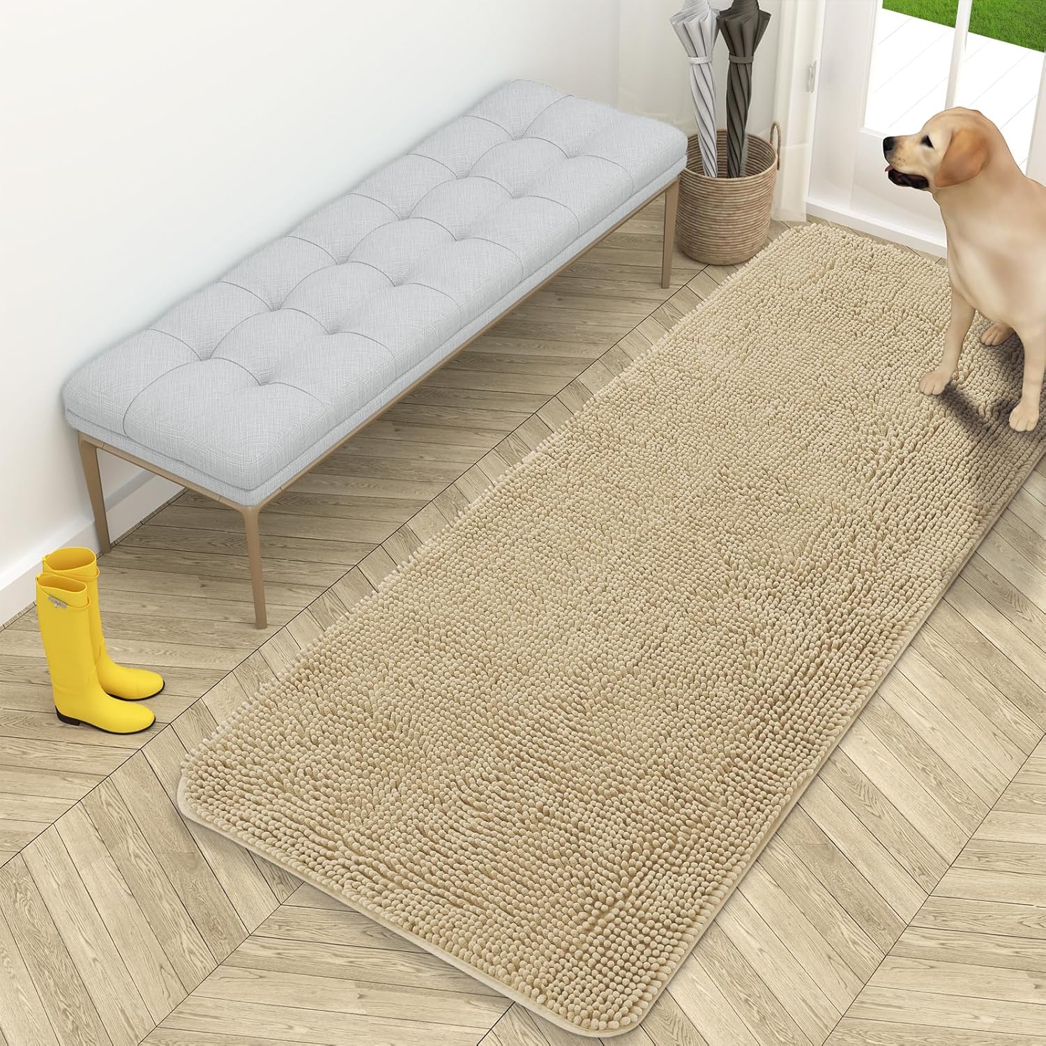 OLANLY Dog Door Mat for Muddy Paws 59x24, Absorbs Moisture and Dirt, Absorbent Non-Slip Washable Doormat, Quick Dry Chenille Mud Mat for Dogs, Entry Indoor Entryway Carpet for Inside Floor, Beige