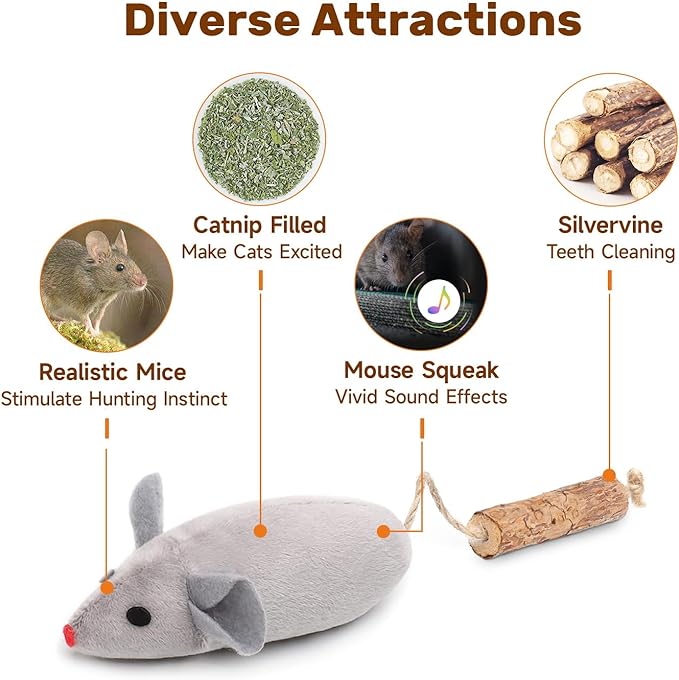 - Pure Catnip & Silvervine: The Mice Toys are stuffed with 100% pure, potent and organic catnip inside. Also comes with silvervine tails. The aroma of catnip and silvervine will maximize the chance to make cats excited and make interactive playtime irresistible. Catnip and silvervine are all natural herbs, It’s helpful to release your fur babies’ boredom and soothe mind for her