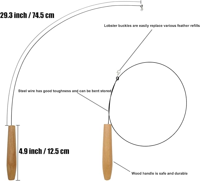 - (Wood Handle Flexible Steel Wire Wand) This cat wand toy is very light, flexible, and easy to store. The fully extended cat toy bar is long enough (34 inch) to cover a lot of play space and it really gives your cat a workout