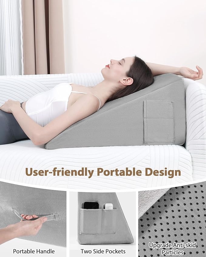 - Convenient Design: This triangle pillow wedge comes with 2 side pockets with different orientations, allowing you to store your phone, glasses, or remote control with ease. The portable handle makes moving the elevation wedge pillow easy, and the anti-slip design at the bottom ensures stability.