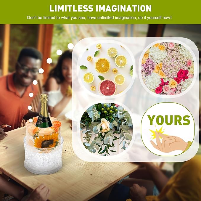 - FUN DIY PROJECT: You can customize your wine chiller by placing flowers, fruits, leaves, or any other items you like in the mold before freezing. The champagne bottle ice mold showcase your creativity and personality, making your drinks more attractive and festive.