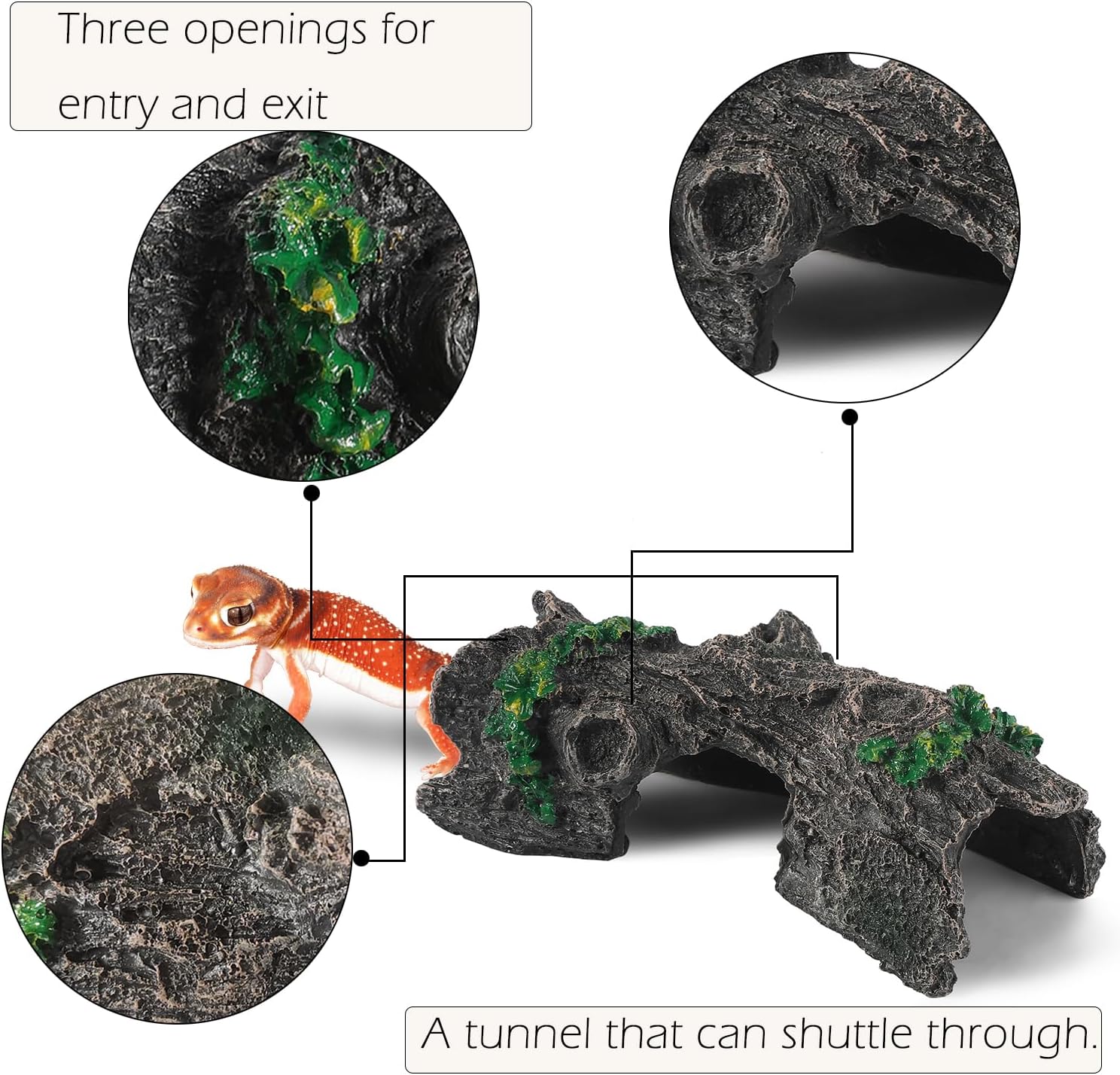 - True to Nature Aquarium Wood Fish Cave – This fake log for fish tank has 5 holes of on the hollow trunk to makes a great fish house / fish hideout for your small fish to rest, hide and play. This log terrarium décor features a true to nature appearance which adds a touch of nature atmosphere to your fish tank.