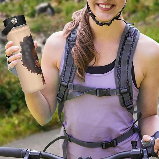 African Girl 18 oz Insulated Water Bottle with Handle Stainless Steel Sports Water Flask Cup Portable Handle Lid Hot and Cold Water Bottle Magic American Afro Travel Canteen Mug