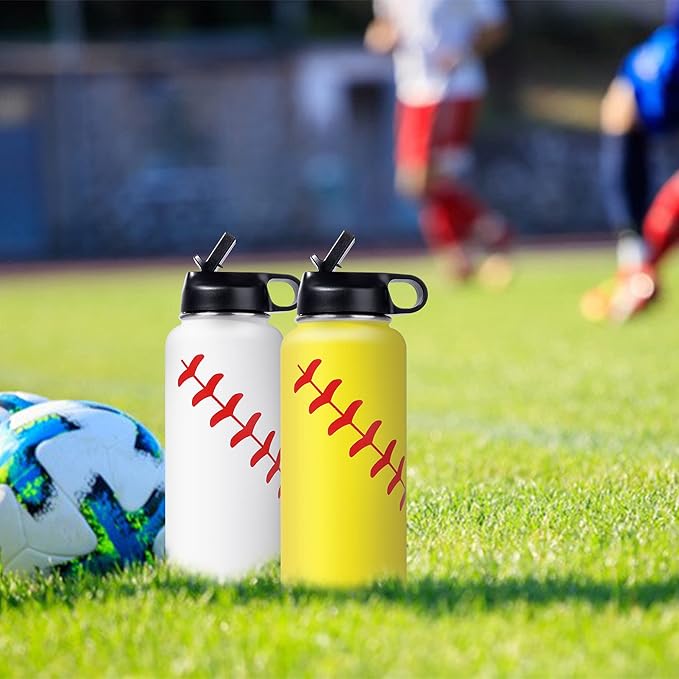 40oz Wide Mouth Baseball Water Bottle with Two Lids(Straw, Handle Lid), 18/8 Stainless Steel Vacuum Insulated for Travel & Sport Cup. (Baseball White, 40oz)
