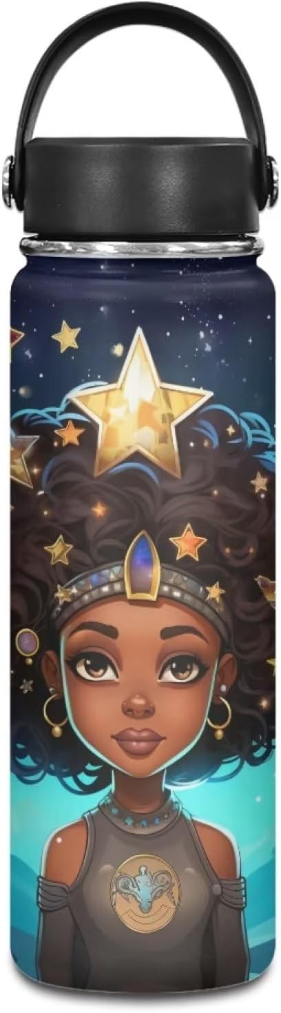 African Princess Insulated Water Bottle 20 oz Stainless Steel Bottle Reusable Wide Mouth African American Girl Water Bottle with Handle Thermal Mug Sports Water American Girl