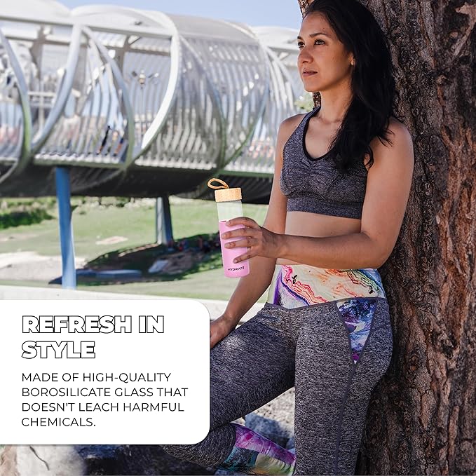 - PROTECTIVE SILICONE SLEEVE GLASS WATER BOTTLE: Our clear glass water bottle comes with a protective silicone sleeve, a bamboo lid, and an extra stainless steel lid for added convenience. It's the perfect unbreakable glass water bottle for your everyday hydration needs