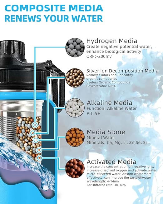 - Quick access to alkaline water: The filter water bottle design ensures that every drop of water is fully passed through the filter, bringing the pH of any water to 9.5+ in just a few minutes. You can enjoy alkaline water with minimal waiting time. It also enriched the water with hydrogen.