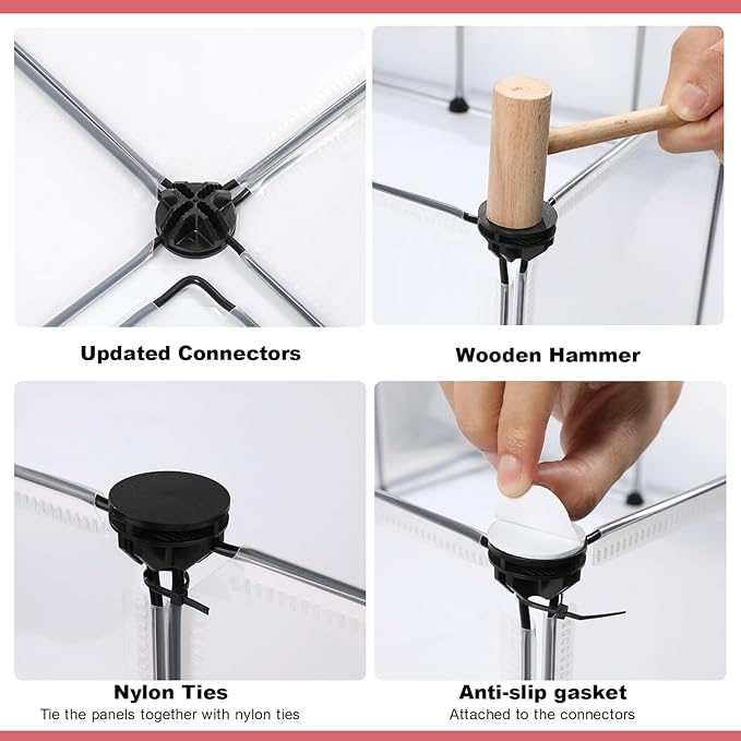 - [Sturdy Design]: Nylon cable ties can stabilize the small pet playpen very well, and the non-slip mats can prevent the baby chicken cage from sliding on the floor, but also protect the floor. It is also difficult for pets to move the fence when playing. ATTENTION: To ensure its stability: ①The connectors need to be fully tightened. ②Use the wooden hammer to reinforce the connectors. ③Tie the panels with zip ties to further reinforce the entire product.④Read the manual carefully.