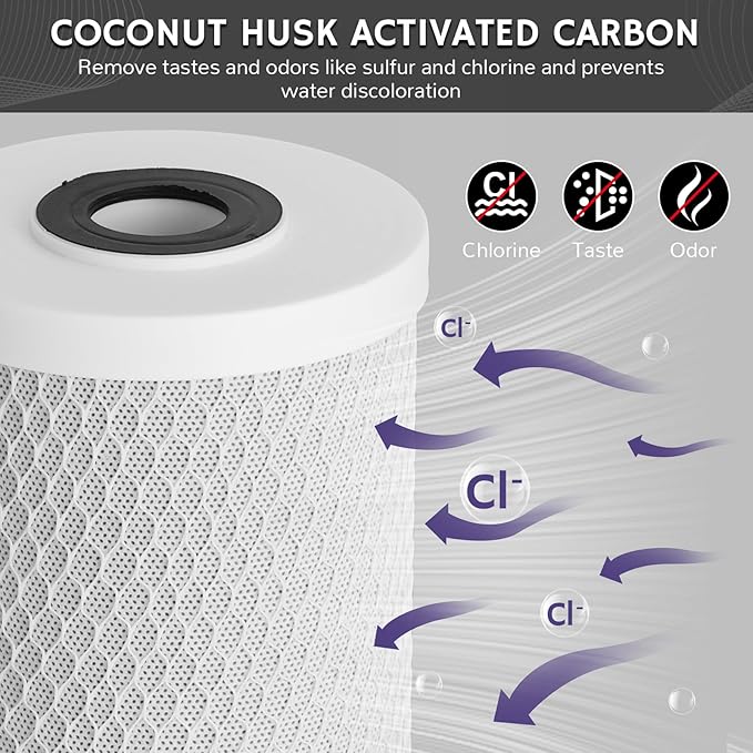 - High-efficiency Filtration: The 5-micron CTO filter can absorb up to 98% of residual chlorine, remove taste and odor, prevent water discoloration, and significantly improve water quality. Use this whole house CTO filter and PP sediment filter in your home water system to protect your water softener and appliances.