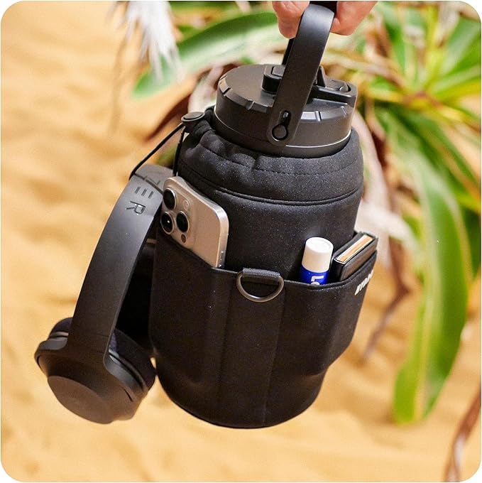 - ⦗ Hydro Gallon Sleeve ⦘ - Patented Neoprene Sleeve Holder / Sling with shoulder strap with metal fasteners, 3 pockets for your phone, keys, wallet, etc.. Drawstring to easily take off / put on the sleeve.