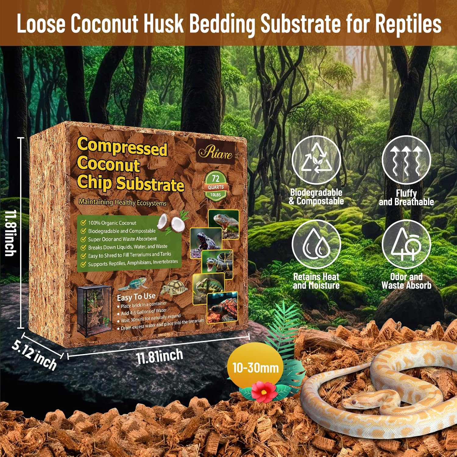 - Widely Application: Riare coconut fiber substrate create a fresh and inviting habitat for snakes, geckos, lizards, tortoises and salamanders to rest and explore, that have large coverage area after expansion with water and easy to clean, it's perfect for reptile terrarium, amphibians, burrowing animals and invertebrates